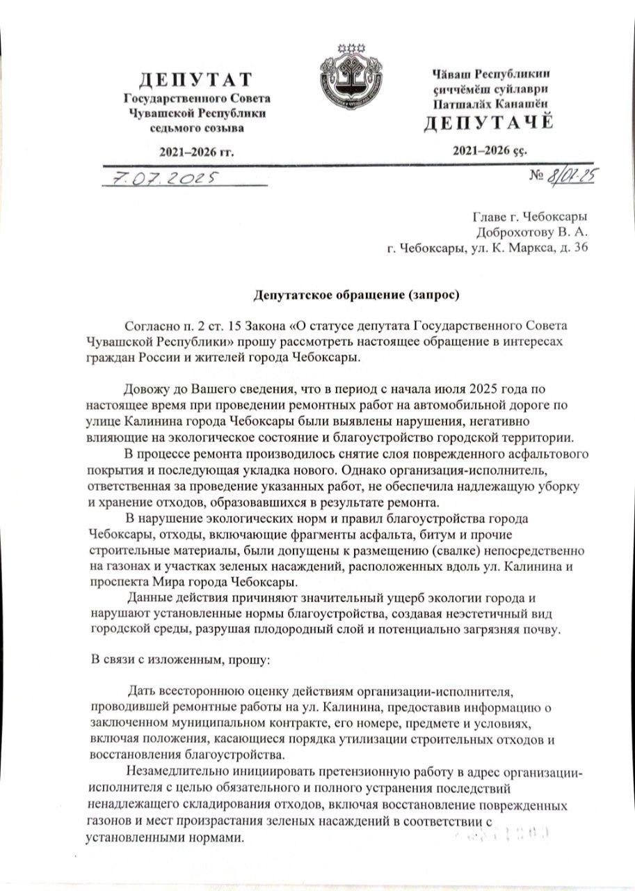 Депутат Госсовета Чувашии от ЛДПР Константин Степанов отметил, что проводимые дорожные работы в Чебоксарах серьезно портят городские газоны и не соответствуют требованиям по восстановлению территории после работ